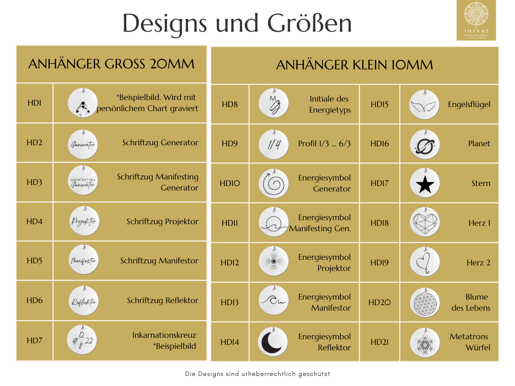 1️⃣ Wähle deine Variante: Großer Anhänger (beidseitig graviert) oder: Großer Anhänger (einseitig graviert) + kleiner Anhänger 2️⃣ Such dir dein Wunschdesign aus (s. Bilder HD1–HD21). 3️⃣ Falls du einen Bodygraphen möchtest, gib folgende Daten an: 📅 Geburtsdatum (TT/MM/JJJJ) ⏰ Geburtszeit (möglichst minutengenau) 📍 Geburtsort (Stadt, Land) Bitte prüfe alle Angaben sorgfältig. 4️⃣ Gib deine Lieferadresse an, damit deine Kette sicher bei dir ankommt. 📩 Nach deiner Bestellung erhältst du unsere Kontaktdaten, um deine personalisierte Kette final zu gestalten! 💖